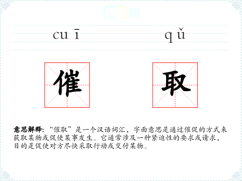 “催取”由两个汉字组成:“催”意味着催促,“取”意味着获取。这个词汇在中文中的使用历史悠久,其基本含义在现代汉语中保持一致。