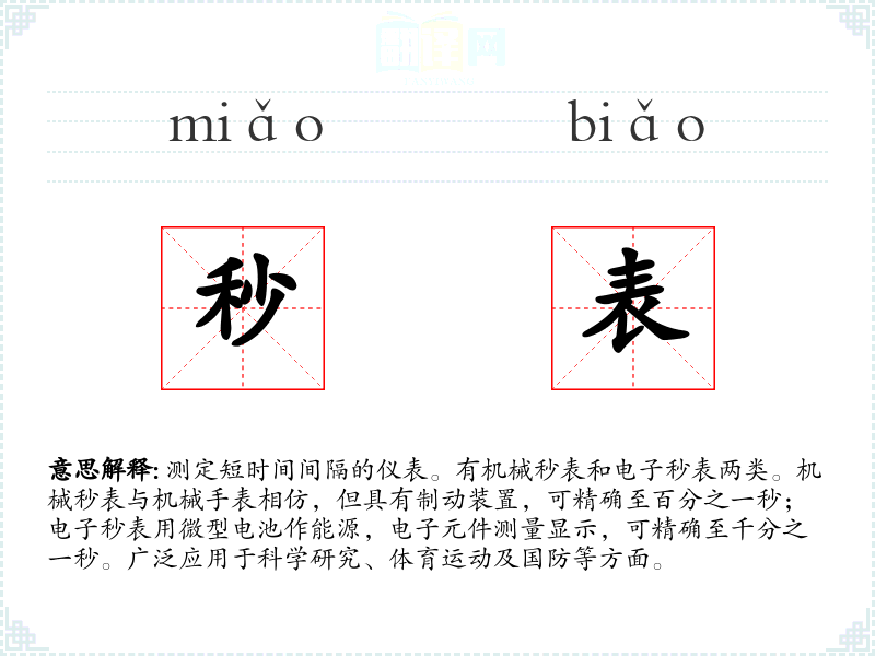 1.测定短时间间隔的仪表。有机械秒表和电子秒表两类。机械秒表与机械手表相仿,但具有制动装置,可精确至百分之一秒;电子秒表用微型电池作能源,电子元件测量显示,可精确至千分之一秒。广泛应用于科学研究、体育运动及国防等方面。