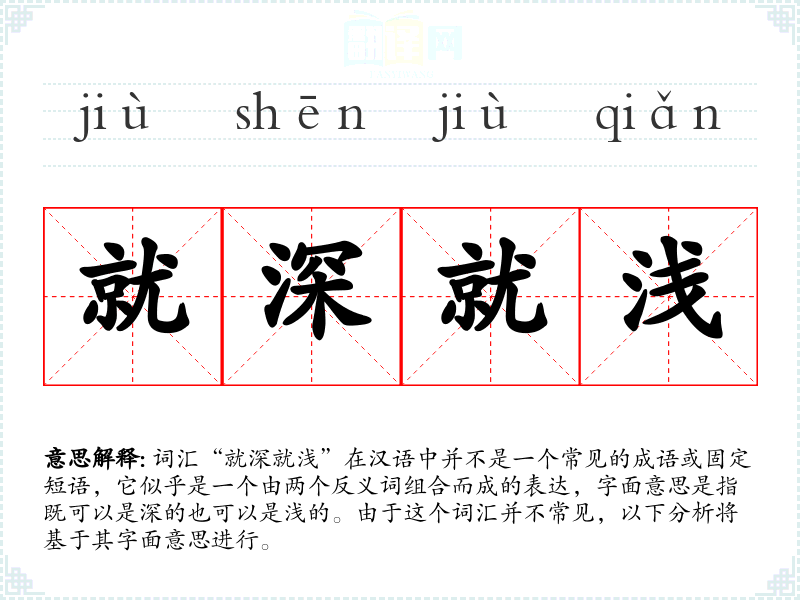 词汇“就深就浅”在汉语中并不是一个常见的成语或固定短语,它似乎是一个由两个反义词组合而成的表达,字面意思是指既可以是深的也可以是浅的。由于这个词汇并不常见,以下分析将基于其字面意思进行。