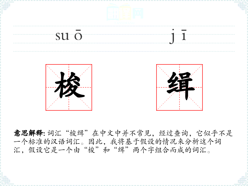 词汇“梭缉”在中文中并不常见,经过查询,它似乎不是一个标准的汉语词汇。因此,我将基于假设的情况来分析这个词汇,假设它是一个由“梭”和“缉”两个字组合而成的词汇。