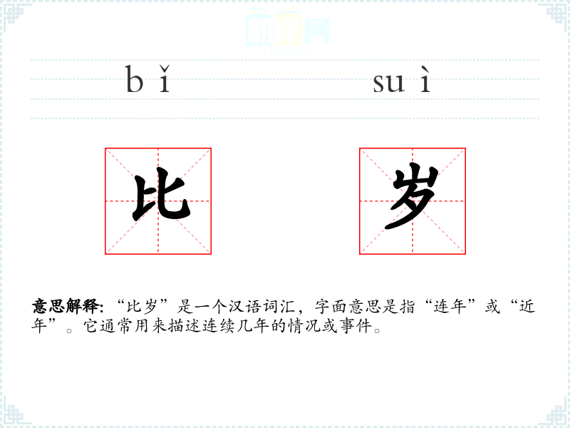 “比岁”是一个汉语词汇,字面意思是指“连年”或“近年”。它通常用来描述连续几年的情况或**。