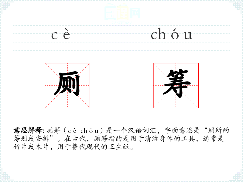 厕筹(cè chóu)是一个汉语词汇,字面意思是“厕所的筹划或安排”。在古代,厕筹指的是用于清洁身体的工具,通常是竹片或木片,用于替代现代的卫生纸。
