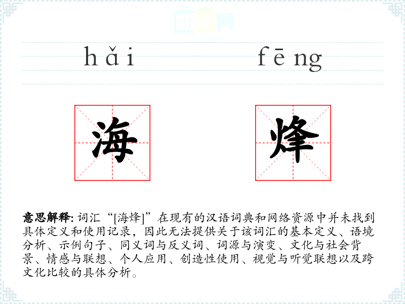 综上所述,由于“海烽”不是一个已知的常用词汇,我们无法提供详细的分析。如果这是一个特定领域或文化中的术语,建议查阅相关的专业文献或咨询该领域的专家以获取更多信息。