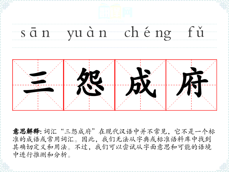 词汇“三怨成府”在现代汉语中并不常见,它不是一个标准的成语或常用词汇。因此,我们无法从字典或标准语料库中找到其确切定义和用法。不过,我们可以尝试从字面意思和可能的语境中进行推测和分析。