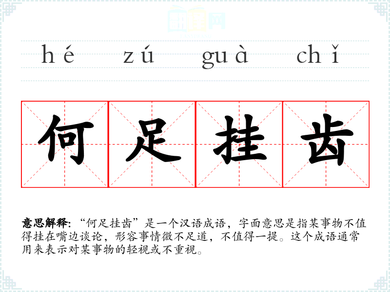 “何足挂齿”是一个汉语成语,字面意思是指某事物不值得挂在嘴边谈论,形容事情微不足道,不值得一提。这个成语通常用来表示对某事物的轻视或不重视。