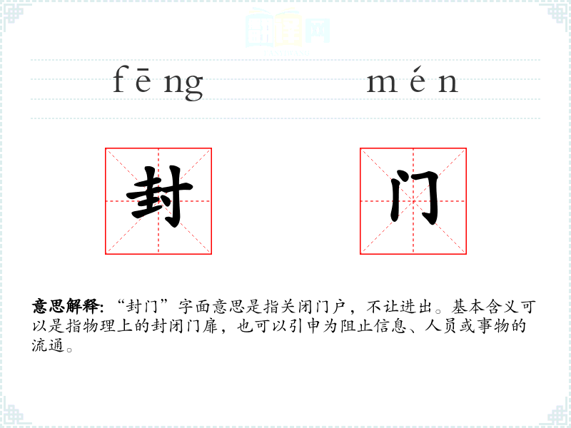 “封门”字面意思是指关闭门户,不让进出。基本含义可以是指物理上的封闭门扉,也可以引申为阻止信息、人员或事物的流通。