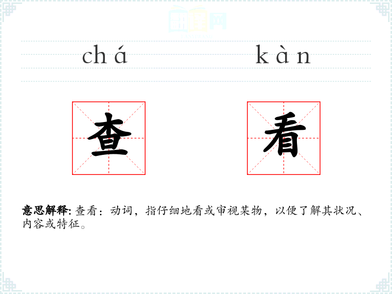 - 词源:“查看”由“查”和“看”两个字组成,“查”字古汉语中意为调查、检查,“看”字则表示视觉上的观察。