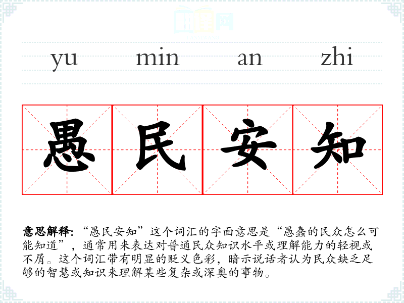 “愚民安知”这个词汇的字面意思是“愚蠢的民众怎么可能知道”,通常用来表达对普通民众知识水平或理解能力的轻视或不屑。这个词汇带有明显的贬义色彩,暗示说话者认为民众缺乏足够的智慧或知识来理解某些复杂或深奥的事物。