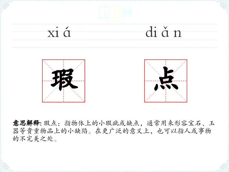 瑕点:指物体上的小瑕疵或缺点,通常用来形容宝石、玉器等贵重物品上的小缺陷。在更广泛的意义上,也可以指人或事物的不完美之处。