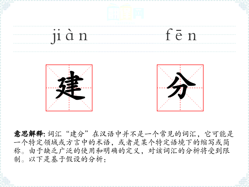 - 由于“建分”不是一个广泛使用的词汇,其词源和演变不明确,可能是一个特定领域或地区的术语。