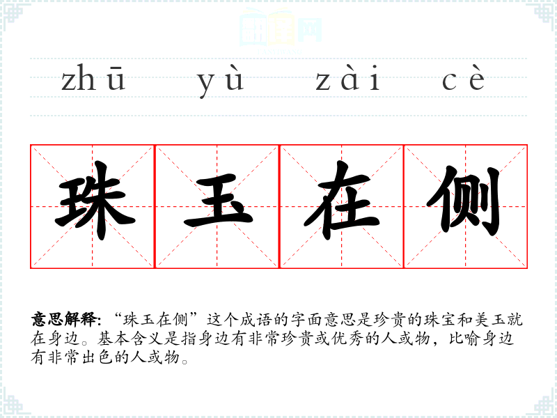 “珠玉在侧”这个成语的字面意思是珍贵的珠宝和美玉就在身边。基本含义是指身边有非常珍贵或优秀的人或物,比喻身边有非常出色的人或物。