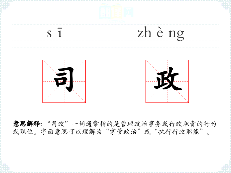 “司政”一词通常指的是管理政治事务或行政职责的行为或职位。字面意思可以理解为“掌管政治”或“执行行政职能”。