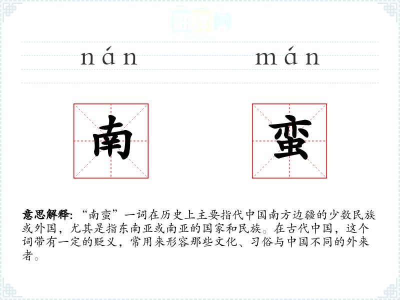同义词可能包括“外夷”、“异族”等,这些词都带有对外来者的描述,但“南蛮”更特指南方边疆的外来者。反义词可能包括“华夏”、“中原”等,这些词代表**中心地带的文化和民族。