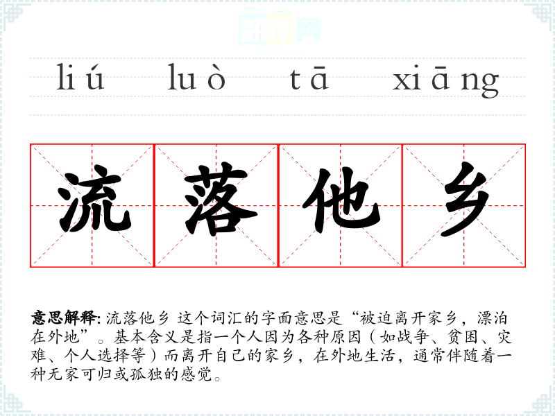 流落他乡 这个词汇的字面意思是“被迫离开家乡,漂泊在外地”。基本含义是指一个人因为各种原因(如战争、贫困、灾难、个人选择等)而离开自己的家乡,在外地生活,通常伴随着一种无家可归或孤独的感觉。