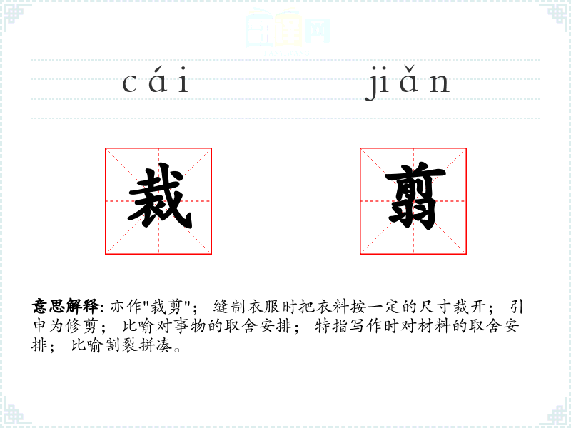 亦作"裁剪"; 缝制衣服时把衣料按一定的尺寸裁开; 引申为修剪; 比喻对事物的取舍安排; 特指写作时对材料的取舍安排; 比喻割裂拼凑。