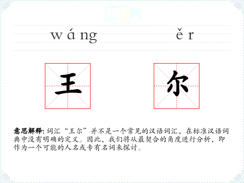 “王尔”可以被理解为一个中文名字,其中“王”是常见的姓氏,“尔”在汉语中可以有“你”的意思,但在这里作为名字的一部分,可能没有具体的字面意义。