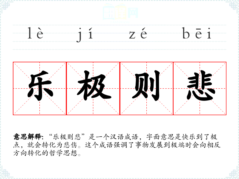 “乐极则悲”是一个汉语成语,字面意思是快乐到了极点,就会转化为悲伤。这个成语强调了事物发展到极端时会向相反方向转化的哲学思想。