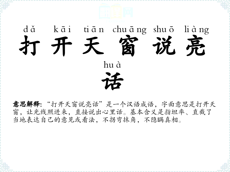 “打开天窗说亮话”是一个汉语成语,字面意思是打开天窗,让光线照进来,直接说出心里话。基本含义是指坦率、直截了当地表达自己的意见或看法,不拐弯抹角,不隐瞒真相。