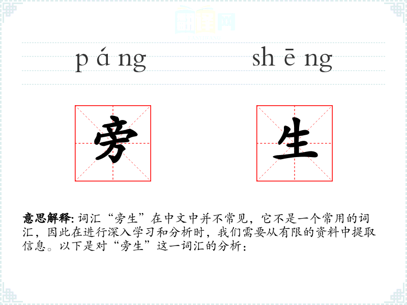 词汇“旁生”在中文中并不常见,它不是一个常用的词汇,因此在进行深入学*和分析时,我们需要从有限的资料中提取信息。以下是对“旁生”这一词汇的分析:
