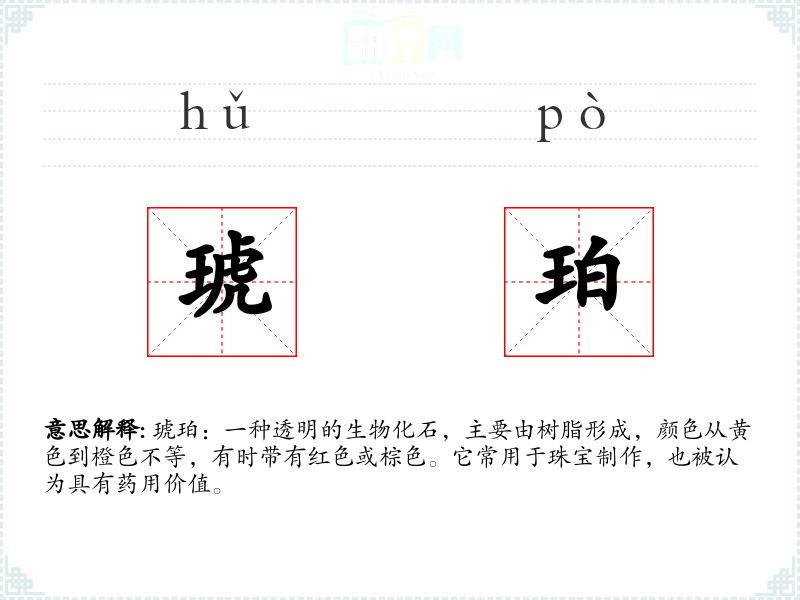 - 反义词:无(琥珀作为一种独特的物质,没有直接的反义词)