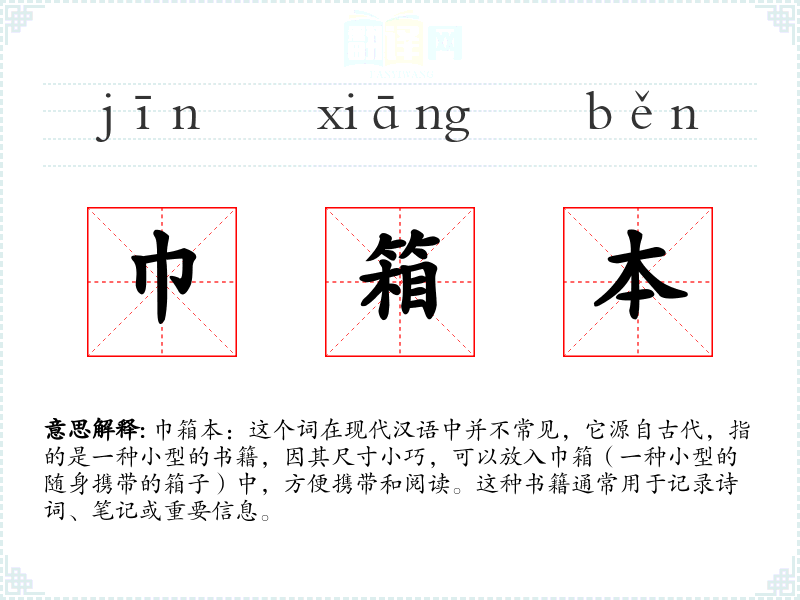 巾箱本:这个词在现代汉语中并不常见,它源自古代,指的是一种小型的书籍,因其尺寸小巧,可以放入巾箱(一种小型的随身携带的箱子)中,方便携带和阅读。这种书籍通常用于记录诗词、笔记或重要信息。