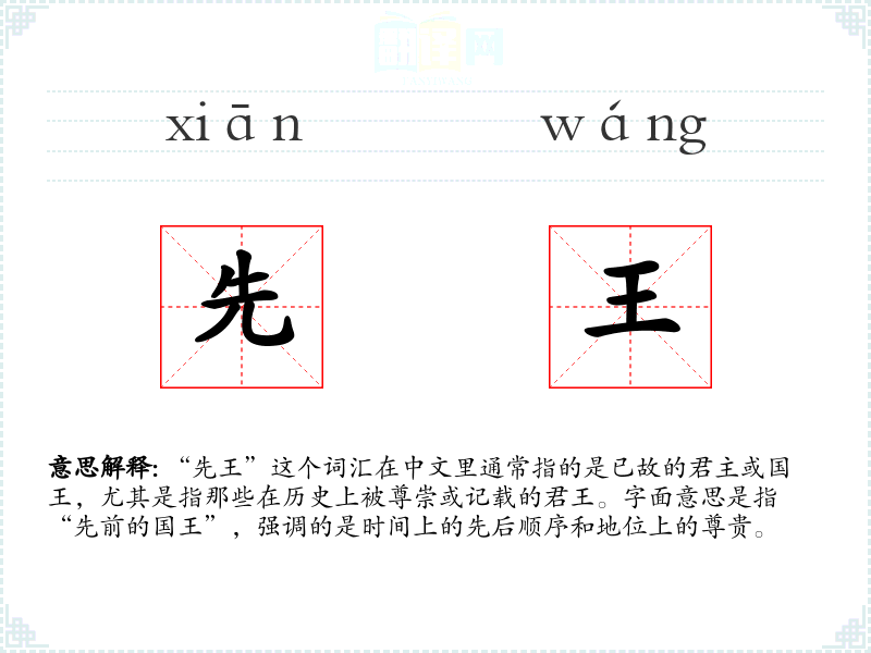 “先王”这个词汇在中文里通常指的是已故的君主或国王,尤其是指那些在历史上被尊崇或记载的君王。字面意思是指“先前的国王”,强调的是时间上的先后顺序和地位上的尊贵。