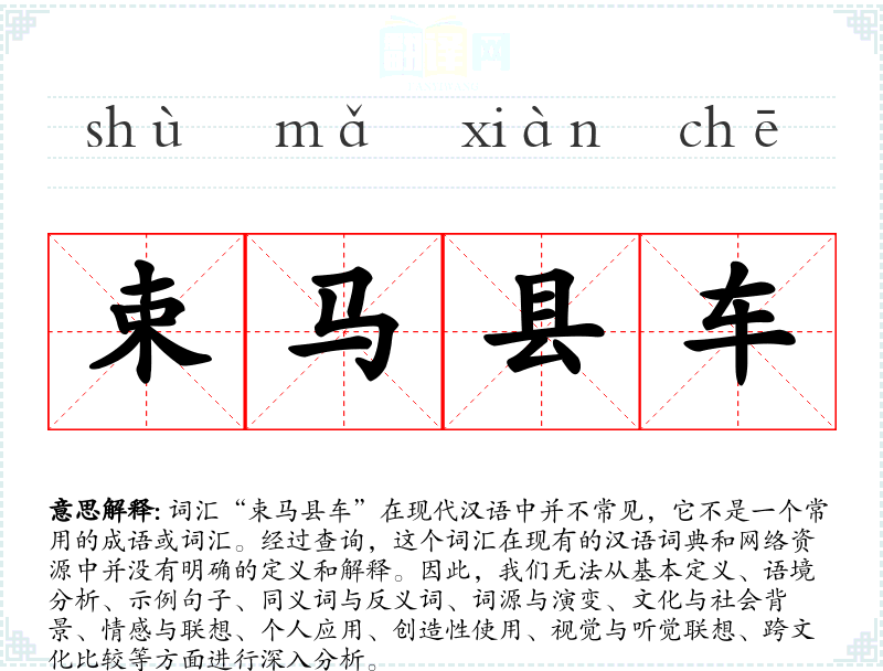 由于“束马县车”不是一个已知的词汇或成语,我们无法提供上述各个方面的详细分析。如果这个词汇是您从某个特定的文献、方言或其他特殊语境中提取的,请提供更多的上下文信息,以便进行更准确的分析。