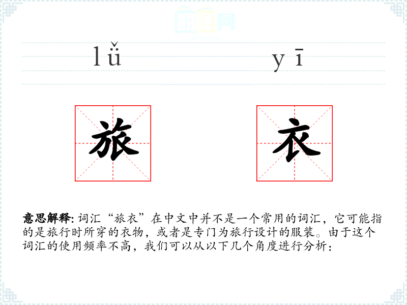 词汇“旅衣”在中文中并不是一个常用的词汇,它可能指的是旅行时所穿的衣物,或者是专门为旅行设计的服装。由于这个词汇的使用频率不高,我们可以从以下几个角度进行分析: