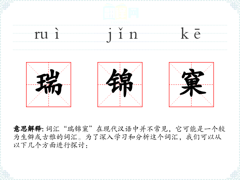 词汇“瑞锦窠”在现代汉语中并不常见,它可能是一个较为生僻或古雅的词汇。为了深入学*和分析这个词汇,我们可以从以下几个方面进行探讨: