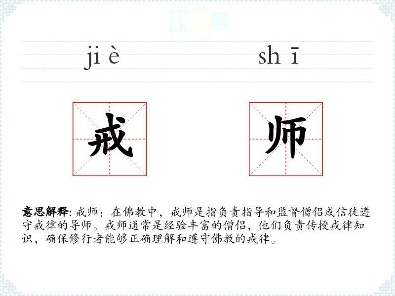 戒师:在中,戒师是指负责指导和监督僧侣或信徒遵守戒律的导师。戒师通常是经验丰富的僧侣,他们负责传授戒律知识,确保修行者能够正确理解和遵守的戒律。