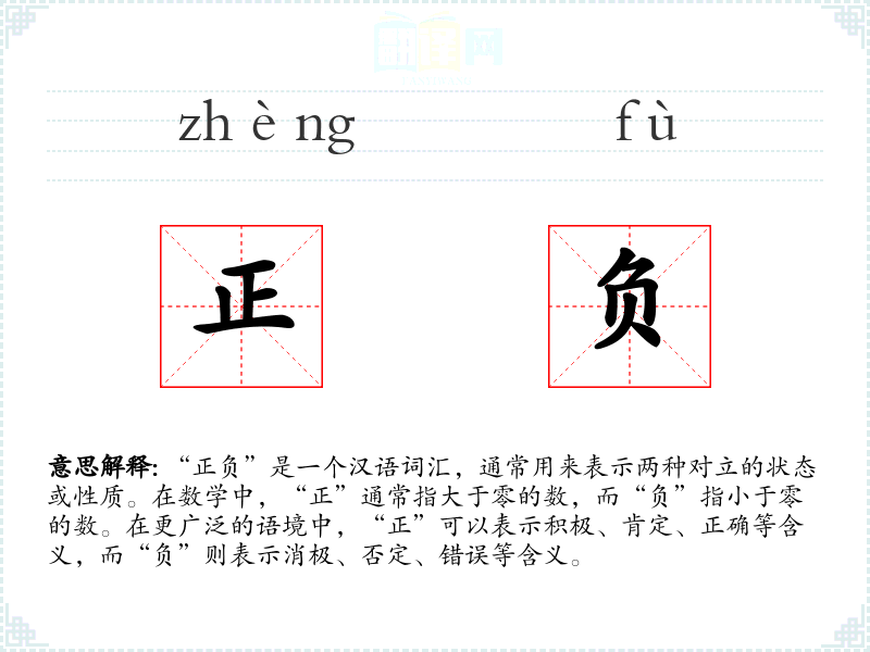 “正负”是一个汉语词汇,通常用来表示两种对立的状态或性质。在数学中,“正”通常指大于零的数,而“负”指小于零的数。在更广泛的语境中,“正”可以表示积极、肯定、正确等含义,而“负”则表示消极、否定、错误等含义。