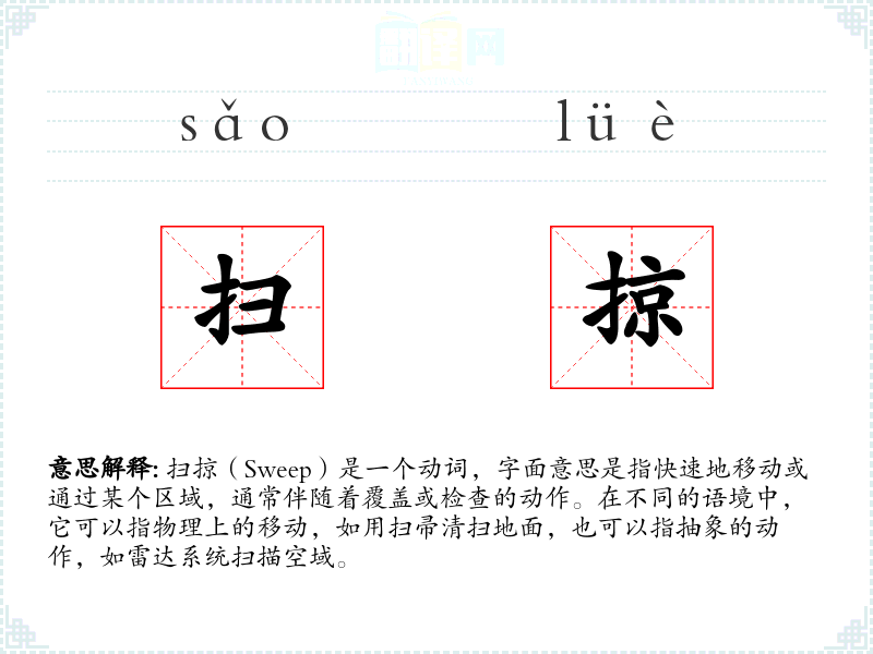 “扫掠”是一个多功能的词汇,适用于多种语境,能够丰富语言表达的层次和动态感。在语言学习和表达中,理解和灵活运用这类词汇对于提升沟通效果至关重要。