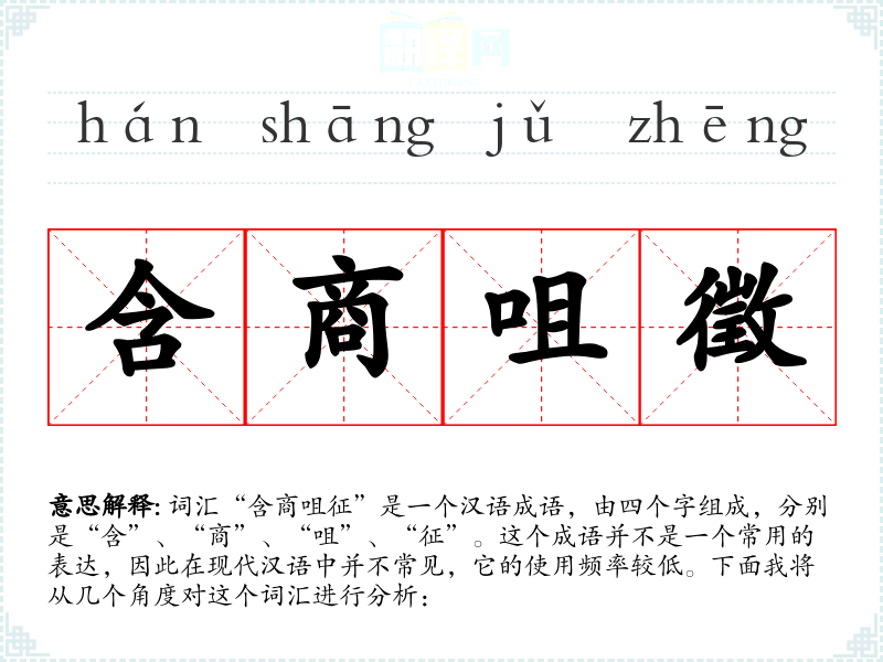 词汇“含商咀征”是一个汉语成语,由四个字组成,分别是“含”、“商”、“咀”、“征”。这个成语并不是一个常用的表达,因此在现代汉语中并不常见,它的使用频率较低。下面我将从几个角度对这个词汇进行分析: