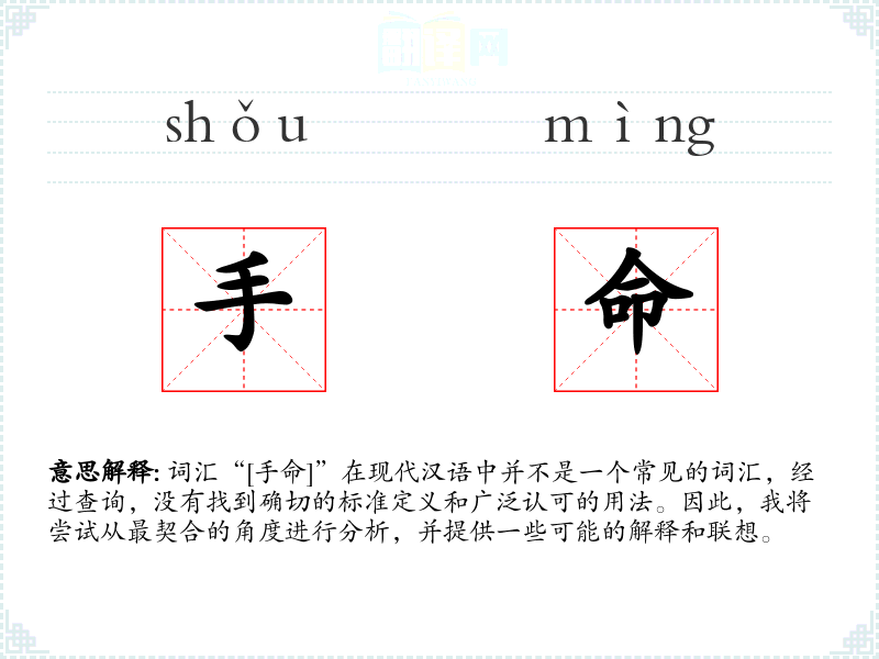 由于“[手命]”不是一个标准词汇,它在不同语境下的使用非常有限。在文学、口语或专业领域中,可能需要创造性的解释或特定的上下文才能理解其含义。