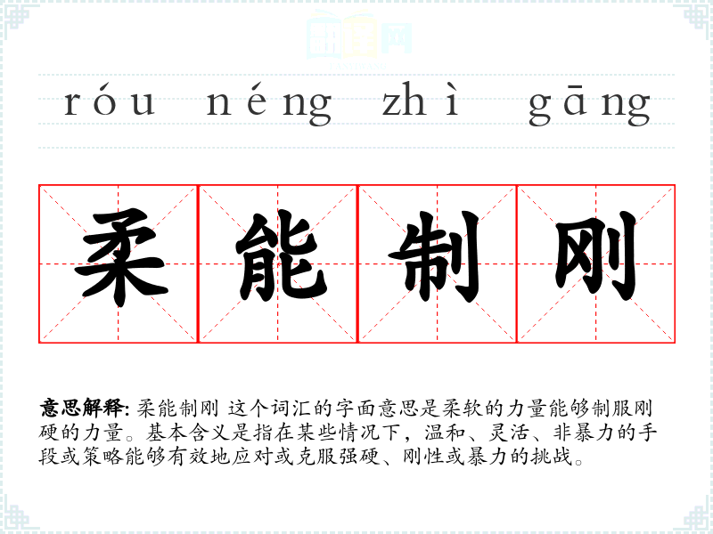 柔能制刚 这个词汇的字面意思是柔软的力量能够制服刚硬的力量。基本含义是指在某些情况下,温和、灵活、非暴力的手段或策略能够有效地应对或克服强硬、刚性或暴力的挑战。