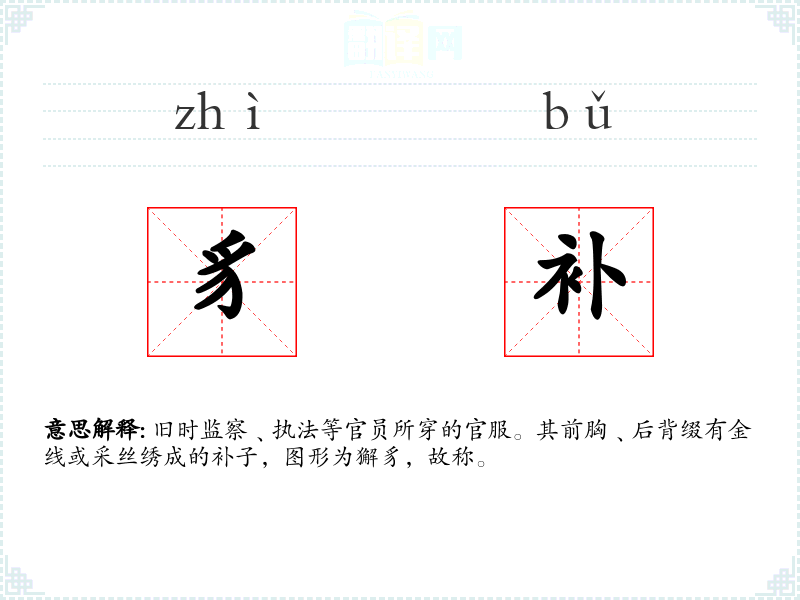 旧时监察﹑执法等官员所穿的官服。其前胸﹑后背缀有金线或采丝绣成的补子,图形为獬豸,故称。