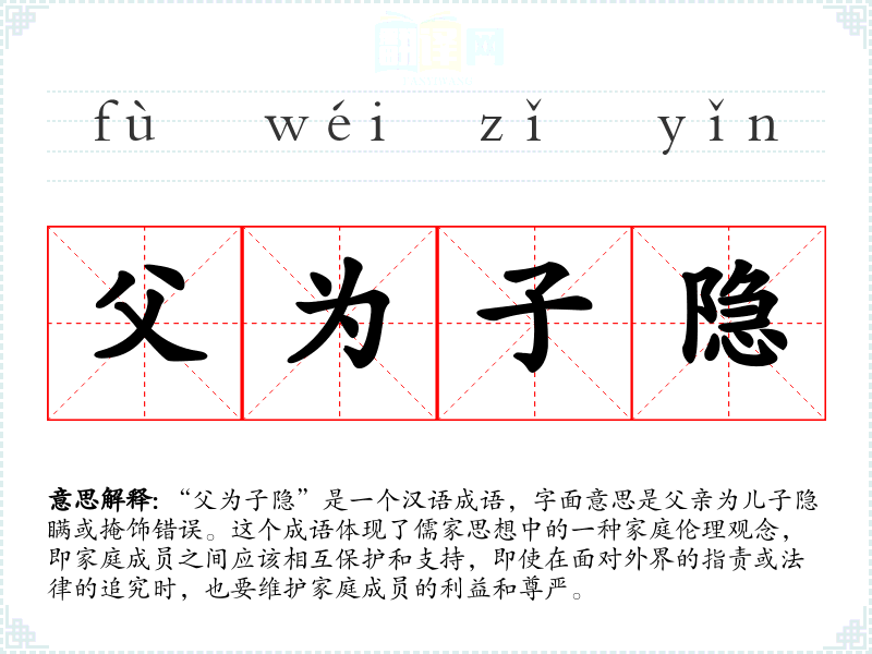 “父为子隐”是一个汉语成语,字面意思是父亲为儿子隐瞒或掩饰错误。这个成语体现了儒家思想中的一种家庭伦理观念,即家庭成员之间应该相互保护和支持,即使在面对外界的指责或法律的追究时,也要维护家庭成员的利益和尊严。