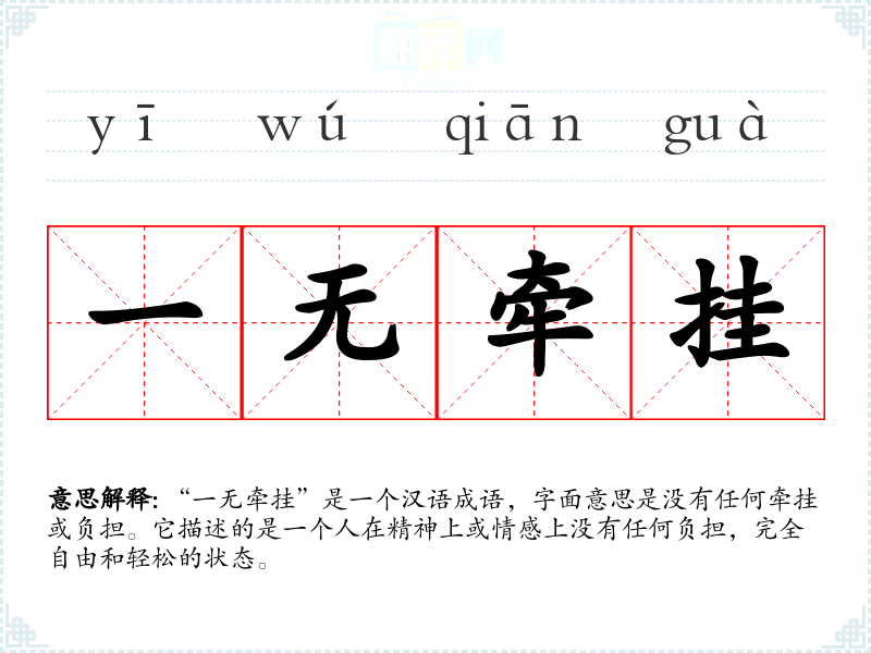 “一无牵挂”是一个汉语成语,字面意思是没有任何牵挂或负担。它描述的是一个人在精神上或情感上没有任何负担,完全自由和轻松的状态。