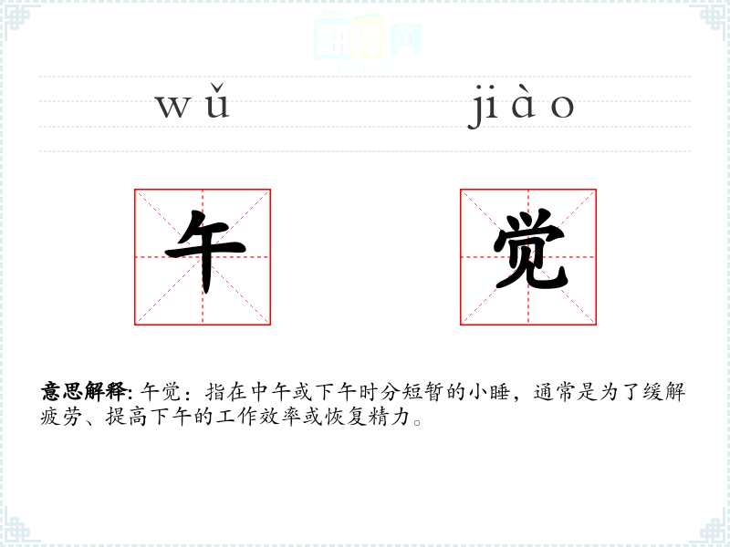午觉一词源于汉语,由“午”和“觉”两个字组成。其中,“午”指中午,“觉”指睡眠。在古代,人们就有午睡的惯,这一惯一直延续至今。