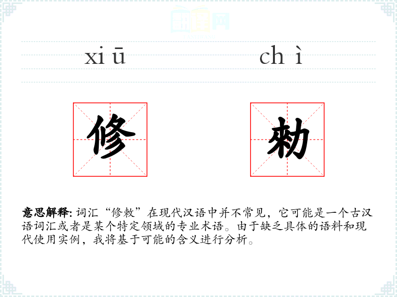 词汇“修敕”在现代汉语中并不常见,它可能是一个古汉语词汇或者是某个特定领域的专业术语。由于缺乏具体的语料和现代使用实例,我将基于可能的含义进行分析。
