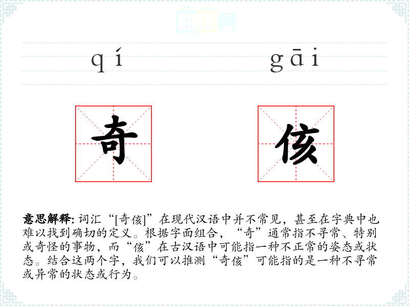 词汇“[奇侅]”在现代汉语中并不常见,甚至在字典中也难以找到确切的定义。根据字面组合,“奇”通常指不寻常、特别或奇怪的事物,而“侅”在古汉语中可能指一种不正常的姿态或状态。结合这两个字,我们可以推测“奇侅”可能指的是一种不寻常或异常的状态或行为。