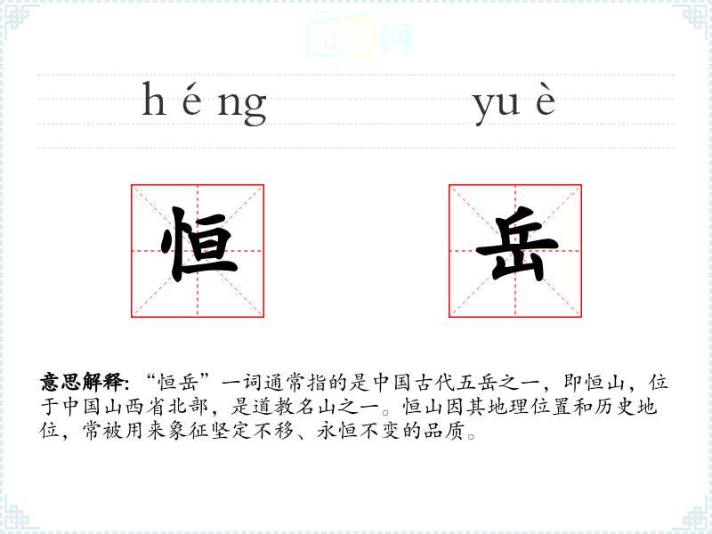 “恒岳”一词通常指的是古代五岳之一,即恒山,位于山西省北部,是道教名山之一。恒山因其地理位置和历史地位,常被用来象征坚定不移、永恒不变的品质。