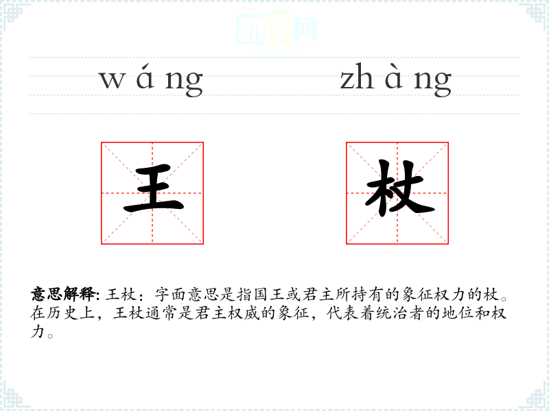 王杖:字面意思是指国王或君主所持有的象征权力的杖。在历史上,王杖通常是君主权威的象征,代表着统治者的地位和权力。