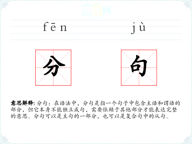 分句:在语法中,分句是指一个句子中包含主语和谓语的部分,但它本身不能独立成句,需要依赖于其他部分才能表达完整的意思。分句可以是主句的一部分,也可以是复合句中的从句。