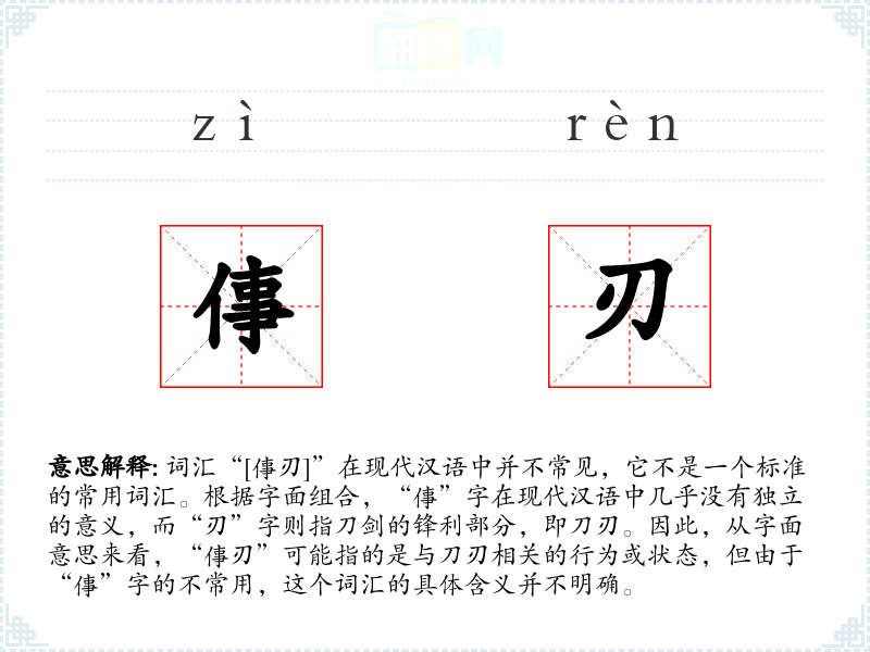 文化与社会背景方面,由于“倳刃”不是一个常用词汇,它在特定文化或社会背景中的意义和影响也非常有限。