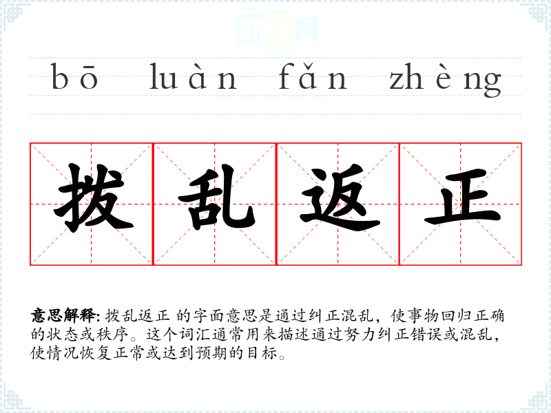 拨乱返正 的字面意思是通过纠正混乱,使事物回归正确的状态或秩序。这个词汇通常用来描述通过努力纠正错误或混乱,使情况恢复正常或达到预期的目标。
