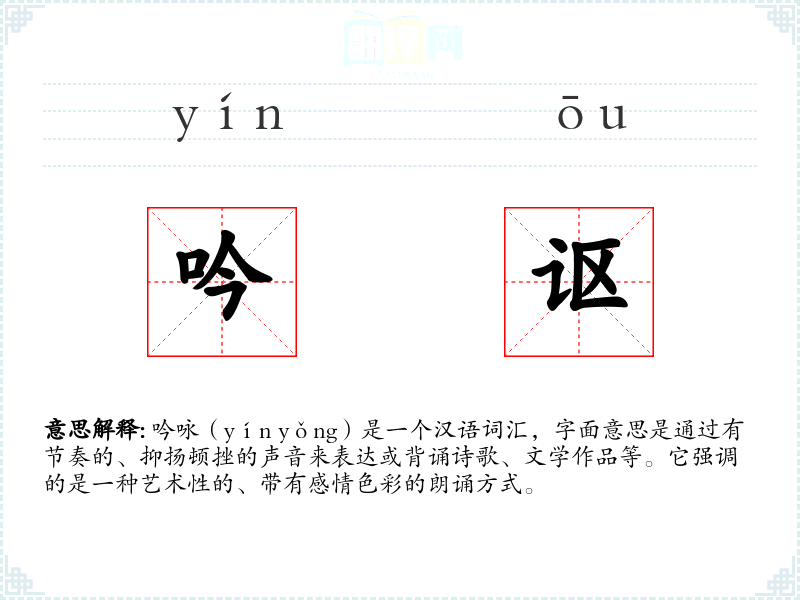 吟咏(yín yǒng)是一个汉语词汇,字面意思是通过有节奏的、抑扬顿挫的声音来表达或背诵诗歌、文学作品等。它强调的是一种艺术性的、带有感情色彩的朗诵方式。