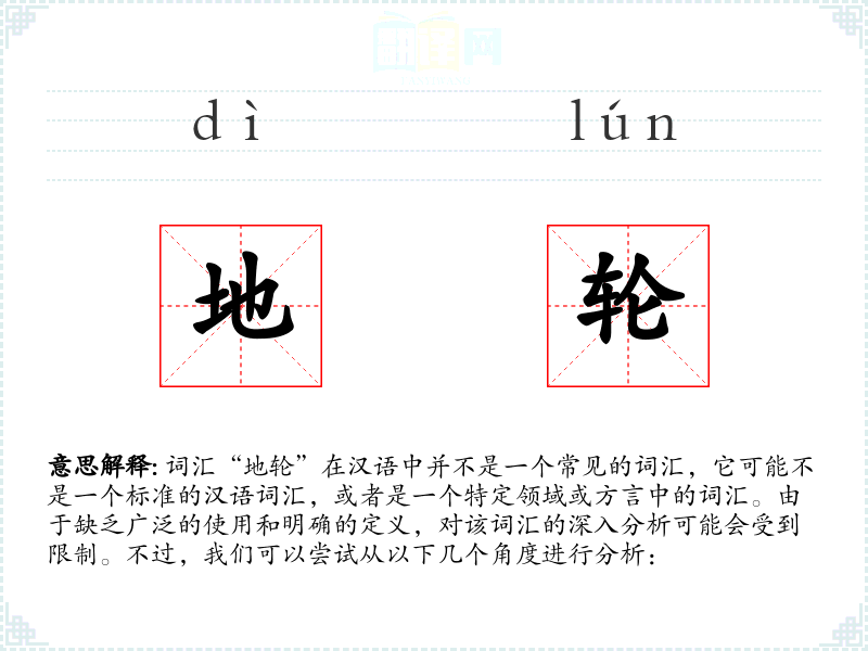 由于“地轮”不是一个标准词汇,我们无法提供一个确切的字面意思和基本含义。它可能是指某种与地面接触的**,或者是一个特定概念的名称。