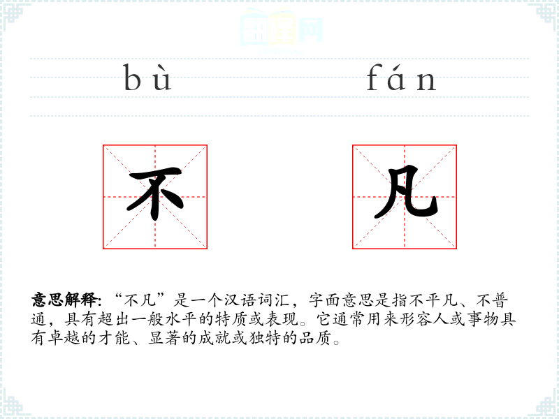 “不凡”是一个汉语词汇,字面意思是指不平凡、不普通,具有超出一般水平的特质或表现。它通常用来形容人或事物具有卓越的才能、显著的成就或独特的品质。