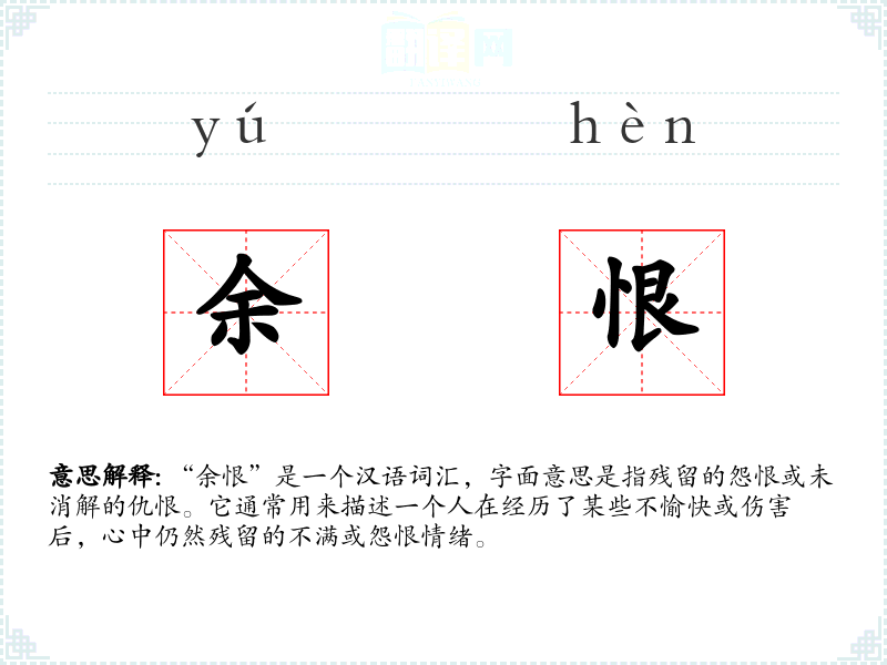“余恨”是一个汉语词汇,字面意思是指残留的怨恨或未消解的仇恨。它通常用来描述一个人在经历了某些不愉快或伤害后,心中仍然残留的不满或怨恨情绪。
